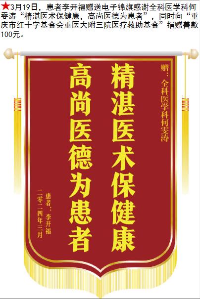 患者李开福赠送电子锦旗感谢全科医学科何雯涛等人,并向医疗救助基金捐赠善款100元。-锦旗-患者心声-患者服务-重庆医科大学附属第三医院【官方网站】