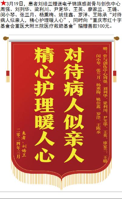 患者刘培兰赠送电子锦旗感谢骨与创伤中心周强等人,并向医疗救助基金捐赠善款100元。-锦旗-患者心声-患者服务-重庆医科大学附属第三医院【官方网站】