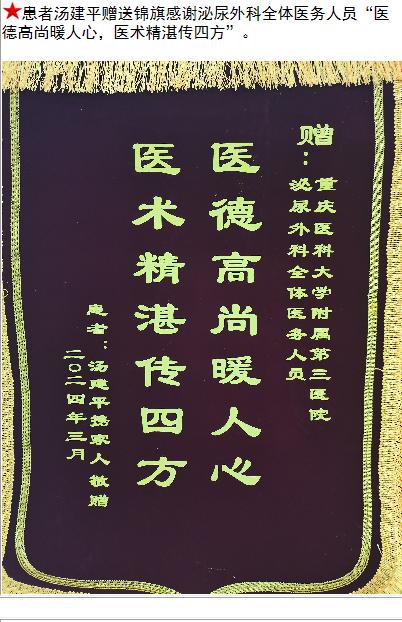 患者汤建平赠送锦旗感谢泌尿外科全体医务人员。-锦旗-患者心声-患者服务-重庆医科大学附属第三医院【官方网站】