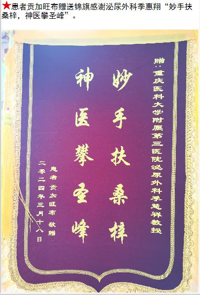 患者贡加旺布赠送锦旗感谢泌尿外科季惠翔。-锦旗-患者心声-患者服务-重庆医科大学附属第三医院【官方网站】