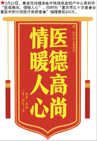 患者范玮赠送电子锦旗感谢妇产中心蒋利华等人,并向医疗救助基金捐赠善款200元。-锦旗-患者心声-患者服务-重庆医科大学附属第三医院【官方网站】