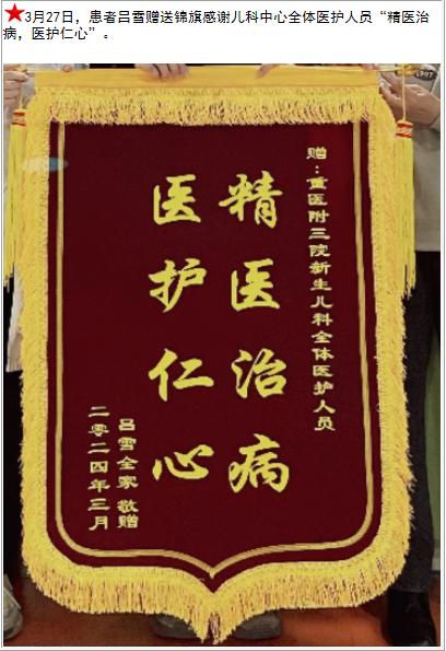 患者吕雪赠送锦旗感谢儿科中心全体医护人员。-锦旗-患者心声-患者服务-重庆医科大学附属第三医院【官方网站】