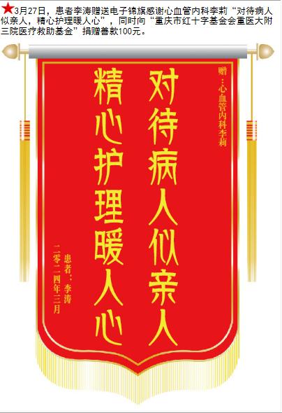 患者李涛赠送电子锦旗感谢心血管内科李莉,并向医疗救助基金捐赠善款100元。-锦旗-患者心声-患者服务-重庆医科大学附属第三医院【官方网站】