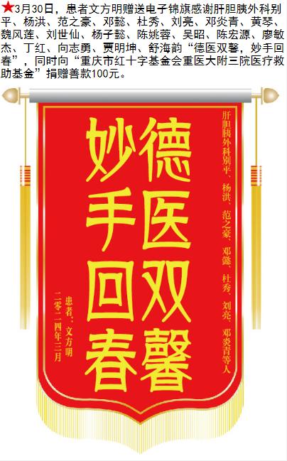 患者文方明赠送电子锦旗感谢肝胆胰外科别平等人,并向医疗救助基金捐赠善款100元。-锦旗-患者心声-患者服务-重庆医科大学附属第三医院【官方网站】