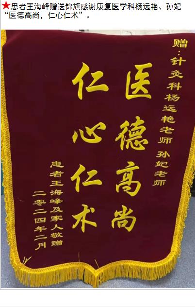 患者王海峰赠送锦旗感谢康复医学科杨远艳等人。