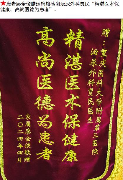 患者廖全俊赠送电子锦旗感谢泌尿外科贾民。-锦旗-患者心声-患者服务-重庆医科大学附属第三医院【官方网站】