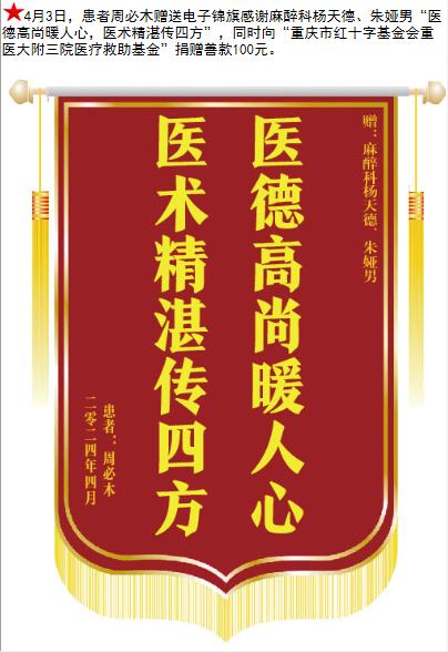 患者周必木赠送电子锦旗感谢麻醉科杨天德等人,并向医疗救助基金捐赠善款100元。-锦旗-患者心声-患者服务-重庆医科大学附属第三医院【官方网站】