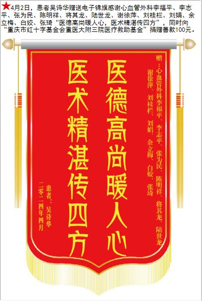 患者吴诗华赠送电子锦旗感谢心血管外科李福平等人,并向医疗救助基金捐赠善款100元。-锦旗-患者心声-患者服务-重庆医科大学附属第三医院【官方网站】