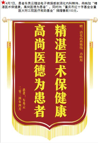 患者车秀云赠送电子锦旗感谢消化内科熊伟等人,并向医疗救助基金捐赠善款100元。-锦旗-患者心声-患者服务-重庆医科大学附属第三医院【官方网站】