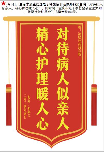 患者朱淑兰赠送电子锦旗感谢泌尿外科蒲春晓,并向医疗救助基金捐赠善款100元。-锦旗-患者心声-患者服务-重庆医科大学附属第三医院【官方网站】