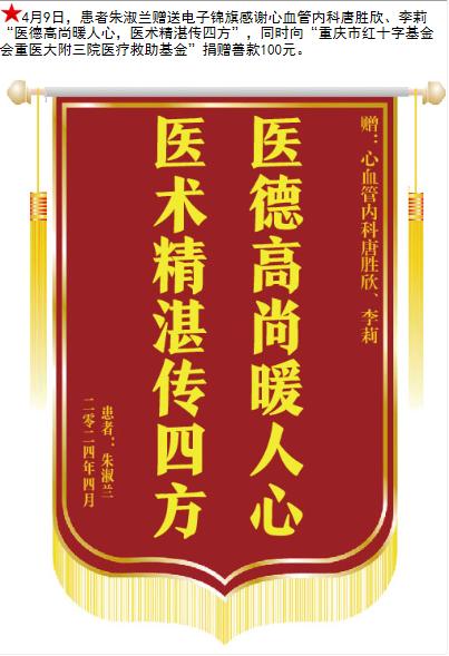 患者朱淑兰赠送电子锦旗感谢心血管内科唐胜欣,并向医疗救助基金捐赠善款100元。-锦旗-患者心声-患者服务-重庆医科大学附属第三医院【官方网站】