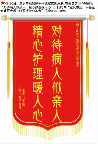 患者王鑫赠送电子锦旗感谢皮肤/整形美容中心张道军,并向医疗救助基金捐赠善款100元。-锦旗-患者心声-患者服务-重庆医科大学附属第三医院【官方网站】