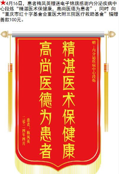 患者梅凤英赠送电子锦旗感谢内分泌疾病中心段炼,并向医疗救助基金捐赠善款100元。-锦旗-患者心声-患者服务-重庆医科大学附属第三医院【官方网站】