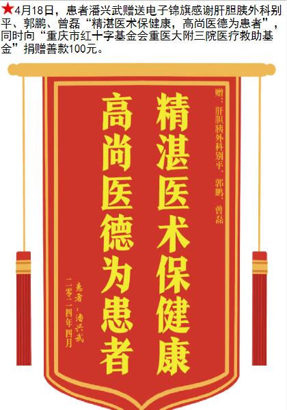 患者潘光武赠送电子锦旗感谢肝胆胰外科别平等人,并向医疗救助基金捐赠善款100元。-锦旗-患者心声-患者服务-重庆医科大学附属第三医院【官方网站】