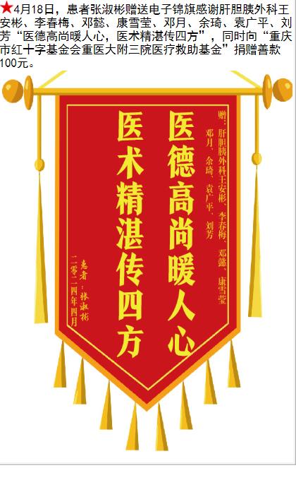 患者张淑彬赠送电子锦旗感谢肝胆胰外科王安彬等人,并向医疗救助基金捐赠善款100元。-锦旗-患者心声-患者服务-重庆医科大学附属第三医院【官方网站】