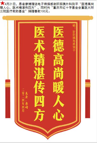 患者廖婧赠送电子锦旗感谢肝胆胰外科别平,并向医疗救助基金捐赠善款100元。-锦旗-患者心声-患者服务-重庆医科大学附属第三医院【官方网站】