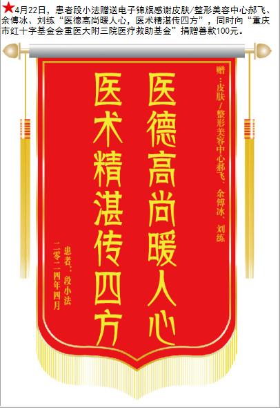 患者段小法赠送电子锦旗感谢皮肤/整形美容中心郝飞等人,并向医疗救助基金捐赠善款100元。-锦旗-患者心声-患者服务-重庆医科大学附属第三医院【官方网站】