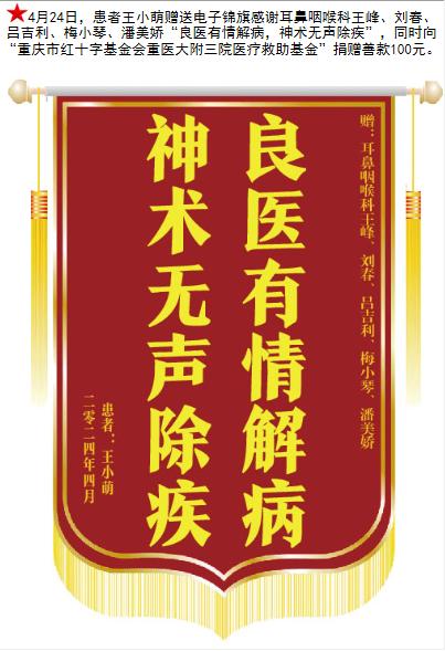 患者王小萌赠送电子锦旗感谢耳鼻咽喉科王峰等人,并向医疗救助基金捐赠善款100元。-锦旗-患者心声-患者服务-重庆医科大学附属第三医院【官方网站】