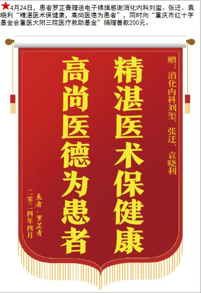 患者罗芷青赠送电子锦旗感谢消化内科刘玺等人,并向医疗救助基金捐赠善款200元。-锦旗-患者心声-患者服务-重庆医科大学附属第三医院【官方网站】