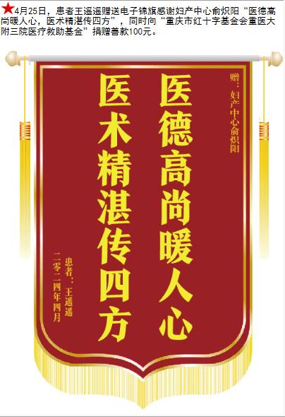 患者王遥遥赠送电子锦旗感谢妇产中心俞炽阳,并向医疗救助基金捐赠善款100元。-锦旗-患者心声-患者服务-重庆医科大学附属第三医院【官方网站】