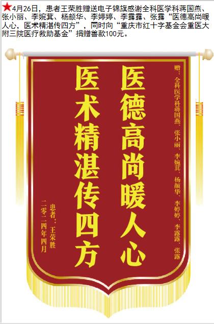 患者王荣胜赠送电子锦旗感谢全科医学科蒋国燕等人,并向医疗救助基金捐赠善款100元。-锦旗-患者心声-患者服务-重庆医科大学附属第三医院【官方网站】