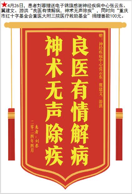 患者刘蓉赠送电子锦旗感谢神经疾病中心张云东等人,并向医疗救助基金捐赠善款100元。-锦旗-患者心声-患者服务-重庆医科大学附属第三医院【官方网站】