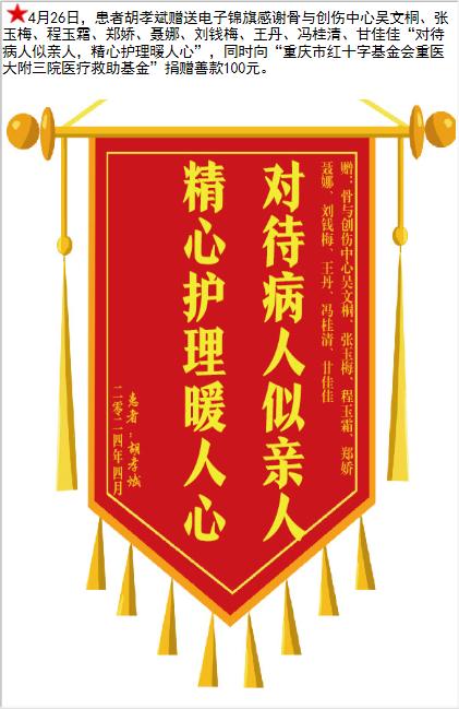 患者胡孝斌赠送电子锦旗感谢骨与创伤中心吴文桐等人,并向医疗救助基金捐赠善款100元。-锦旗-患者心声-患者服务-重庆医科大学附属第三医院【官方网站】