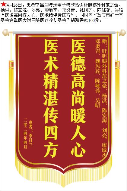 患者李昌兰赠送电子锦旗感谢肝胆胰外科范之豪等人,并向医疗救助基金捐赠善款100元。-锦旗-患者心声-患者服务-重庆医科大学附属第三医院【官方网站】