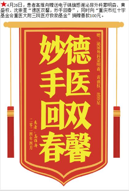患者高维舟赠送电子锦旗感谢泌尿外科蒙明森等人,并向医疗救助基金捐赠善款100元。-锦旗-患者心声-患者服务-重庆医科大学附属第三医院【官方网站】