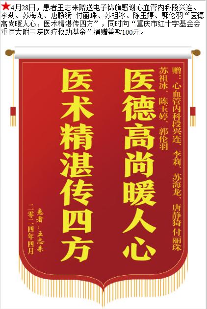 患者王志来赠送电子锦旗感谢心血管内科段兴连等人,并向医疗救助基金捐赠善款100元。-锦旗-患者心声-患者服务-重庆医科大学附属第三医院【官方网站】