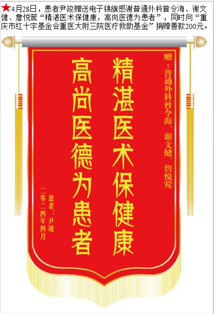 患者尹竣赠送电子锦旗感谢普通外科曾令海等人,并向医疗救助基金捐赠善款200元。-锦旗-患者心声-患者服务-重庆医科大学附属第三医院【官方网站】