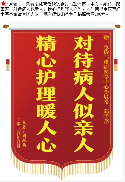 患者周成菊詹赠送急诊与重症医学中心李晨希等人,并向医疗救助基金捐赠善款100元。-锦旗-患者心声-患者服务-重庆医科大学附属第三医院【官方网站】
