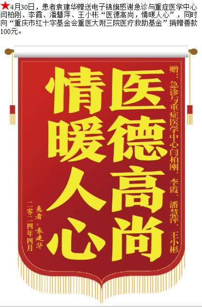 患者袁建华赠送电子锦旗感谢急诊与重症医学中心闫柏刚等人,并向医疗救助基金捐赠善款100元。-锦旗-患者心声-患者服务-重庆医科大学附属第三医院【官方网站】