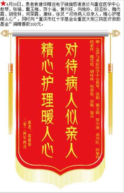 患者袁建华赠送电子锦旗感谢急诊与重症医学中心敖琴等人,并向医疗救助基金捐赠善款100元。-锦旗-患者心声-患者服务-重庆医科大学附属第三医院【官方网站】