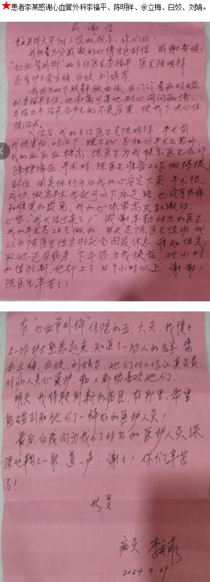 患者李某的感谢信。-锦旗-患者心声-患者服务-重庆医科大学附属第三医院【官方网站】