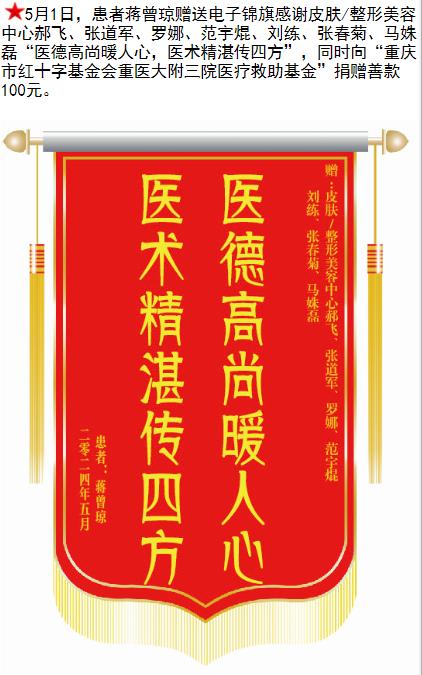 患者蒋曾琼赠送电子锦旗感谢皮肤/整形美容中心郝飞等人,并向医疗救助基金捐赠善款100元。-锦旗-患者心声-患者服务-重庆医科大学附属第三医院【官方网站】