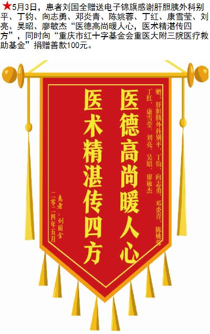 患者刘国全赠送电子锦旗感谢肝胆胰外科别平等人,并向医疗救助基金捐赠善款100元。-锦旗-患者心声-患者服务-重庆医科大学附属第三医院【官方网站】