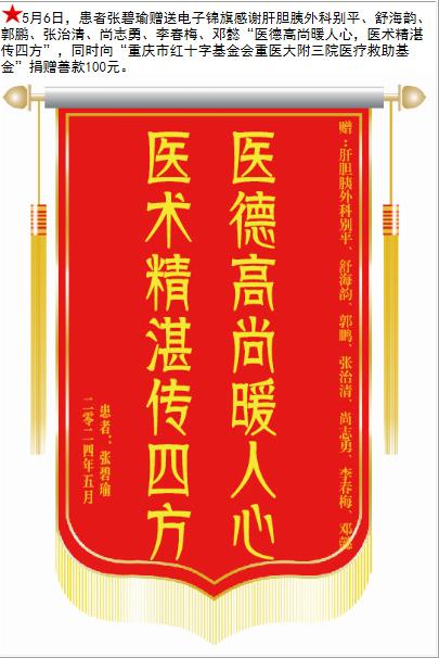 患者张碧瑜赠送电子锦旗感谢肝胆胰外科别平等人,并向医疗救助基金捐赠善款100元。-锦旗-患者心声-患者服务-重庆医科大学附属第三医院【官方网站】