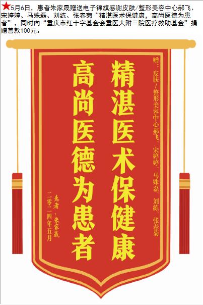 患者朱家晟赠送电子锦旗感谢皮肤/整形美容中心郝飞等人,并向医疗救助基金捐赠善款100元。-锦旗-患者心声-患者服务-重庆医科大学附属第三医院【官方网站】