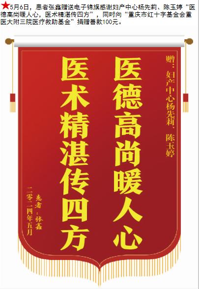 患者张鑫赠送电子锦旗感谢妇产中心杨先莉等人,并向医疗救助基金捐赠善款100元。-锦旗-患者心声-患者服务-重庆医科大学附属第三医院【官方网站】