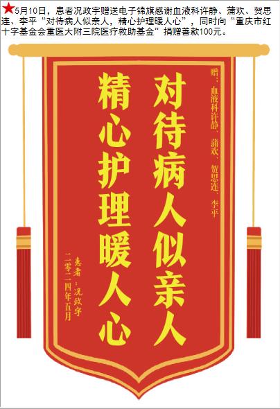 患者况政宇赠送电子锦旗感谢血液科许静等人,并向医疗救助基金捐赠善款100元。-锦旗-患者心声-患者服务-重庆医科大学附属第三医院【官方网站】