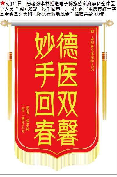 患者张孝林赠送电子锦旗感谢麻醉科全体医护人员,并向医疗救助基金捐赠善款100元。-锦旗-患者心声-患者服务-重庆医科大学附属第三医院【官方网站】