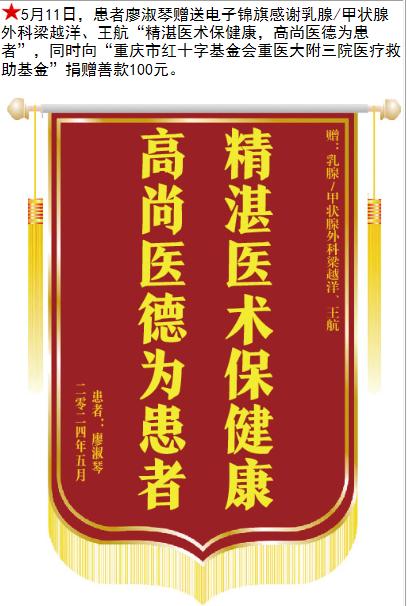 患者廖淑琴赠送电子锦旗感谢乳腺/甲状腺外科梁越洋等人,并向医疗救助基金捐赠善款100元。-锦旗-患者心声-患者服务-重庆医科大学附属第三医院【官方网站】