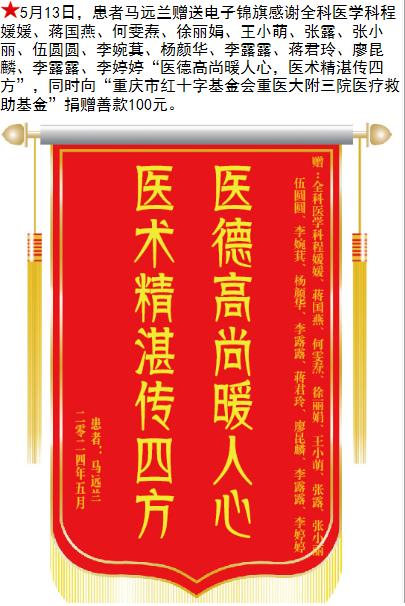 患者马远兰赠送电子锦旗感谢全科医学科程媛媛等人,并向医疗救助基金捐赠善款100元。-锦旗-患者心声-患者服务-重庆医科大学附属第三医院【官方网站】