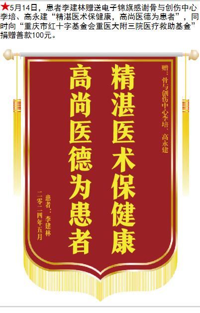 患者李建林赠送电子锦旗感谢骨与创伤中心李培等人,并向医疗救助基金捐赠善款100元。-锦旗-患者心声-患者服务-重庆医科大学附属第三医院【官方网站】