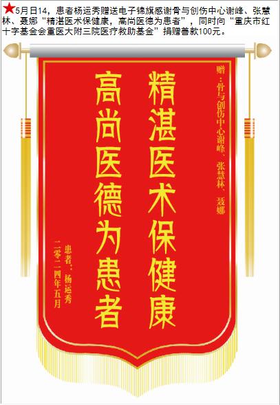 患者杨运秀赠送电子锦旗感谢骨与创伤中心谢峰等人,并向医疗救助基金捐赠善款100元。-锦旗-患者心声-患者服务-重庆医科大学附属第三医院【官方网站】