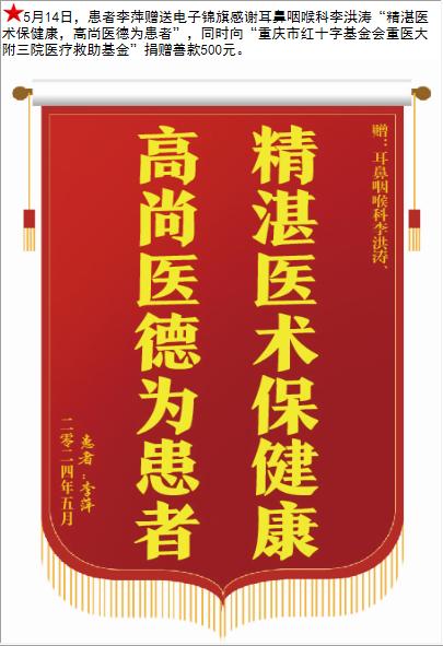 患者李萍赠送电子锦旗感谢耳鼻咽喉科李洪涛,并向医疗救助基金捐赠善款500元。-锦旗-患者心声-患者服务-重庆医科大学附属第三医院【官方网站】
