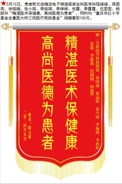 患者斯元慈赠送电子锦旗感谢全科医学科程媛媛等人,并向医疗救助基金捐赠善款100元。-锦旗-患者心声-患者服务-重庆医科大学附属第三医院【官方网站】