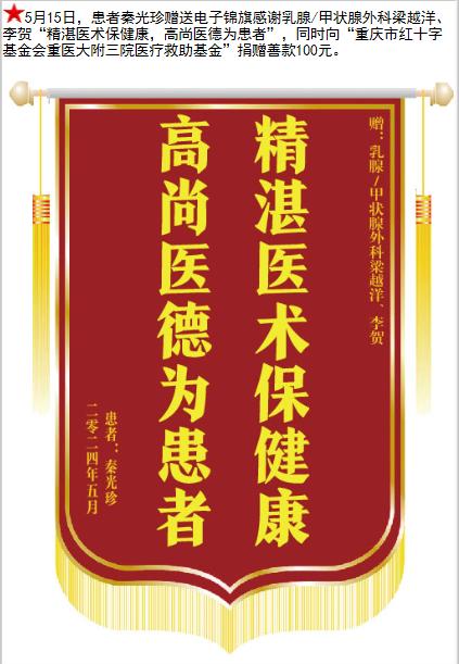 患者秦光珍赠送电子锦旗感谢乳腺/甲状腺外科梁越洋等人,并向医疗救助基金捐赠善款100元。-锦旗-患者心声-患者服务-重庆医科大学附属第三医院【官方网站】