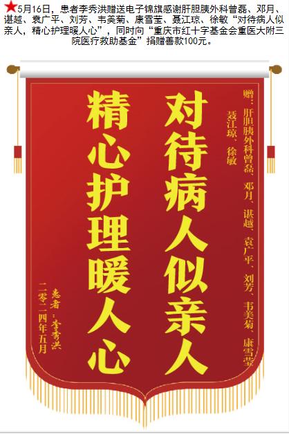 患者李秀洪赠送电子锦旗感谢肝胆胰外科曾磊等人,并向医疗救助基金捐赠善款100元。-锦旗-患者心声-患者服务-重庆医科大学附属第三医院【官方网站】